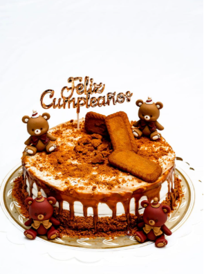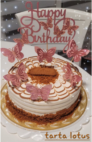 Inconfundible sabor a galletas Lotus, capas de bizcocho de vainilla cubiertas de crema de galletas Lotus más una suave nata decorada con migas de galletas Lotus, rica y muy jugosa.