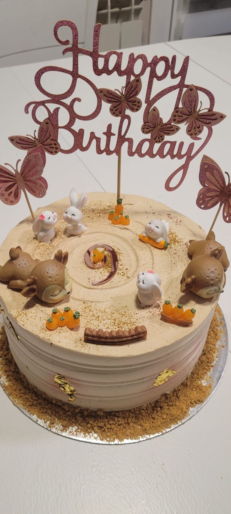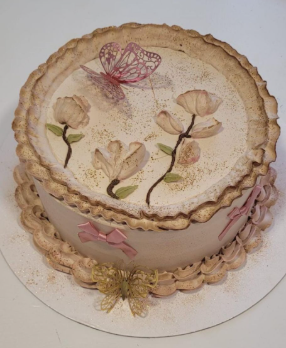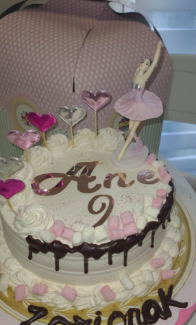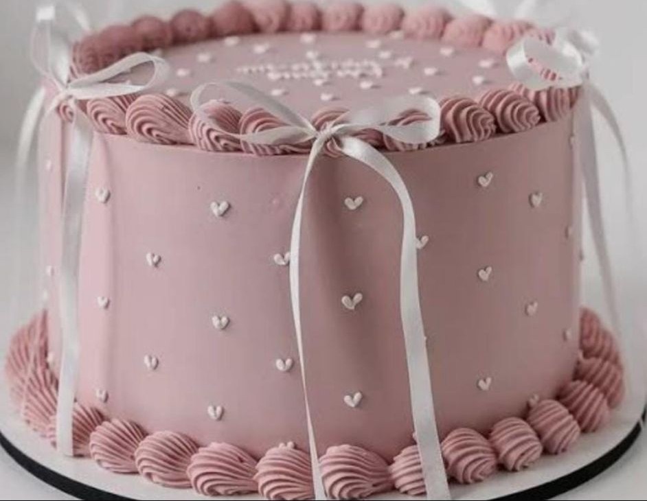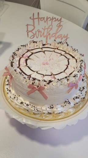 La más bonita, preciosa tarta compuesta de 3 capas de riquísimo bizcocho de chocolate relleno de crema pastelera, nata o mousse de chocolate, cubierta de nata y adornada con perlas de azúcar, polvo de oro rosa comestible y lacitos alrededor.