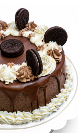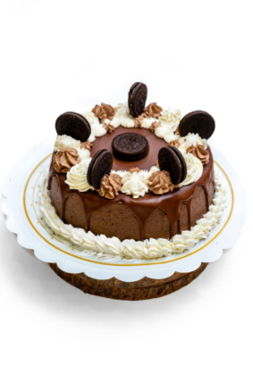 Inconfundible tarta Oreo, riquísimo bizcocho de chocolate y vainilla bañado de crema Oreo en todas sus capas y relleno de nata y trocitos de galletas Oreo, cubierto de crema, ganache y galletas Oreo.