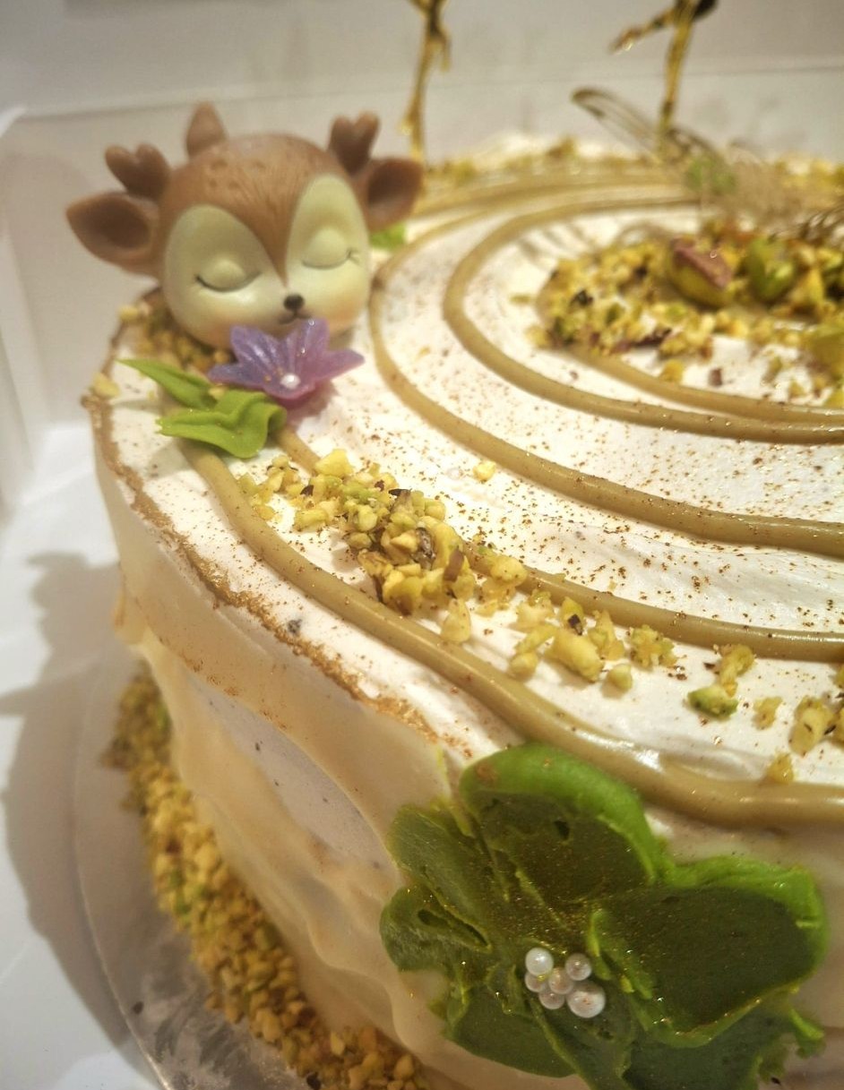 Siguiendo las nuevas tendencias os presentamos esta tarta con una combinación perfecta de sabores de pistacho y chocolate blanco, riquísima y de sabor suave y delicado.